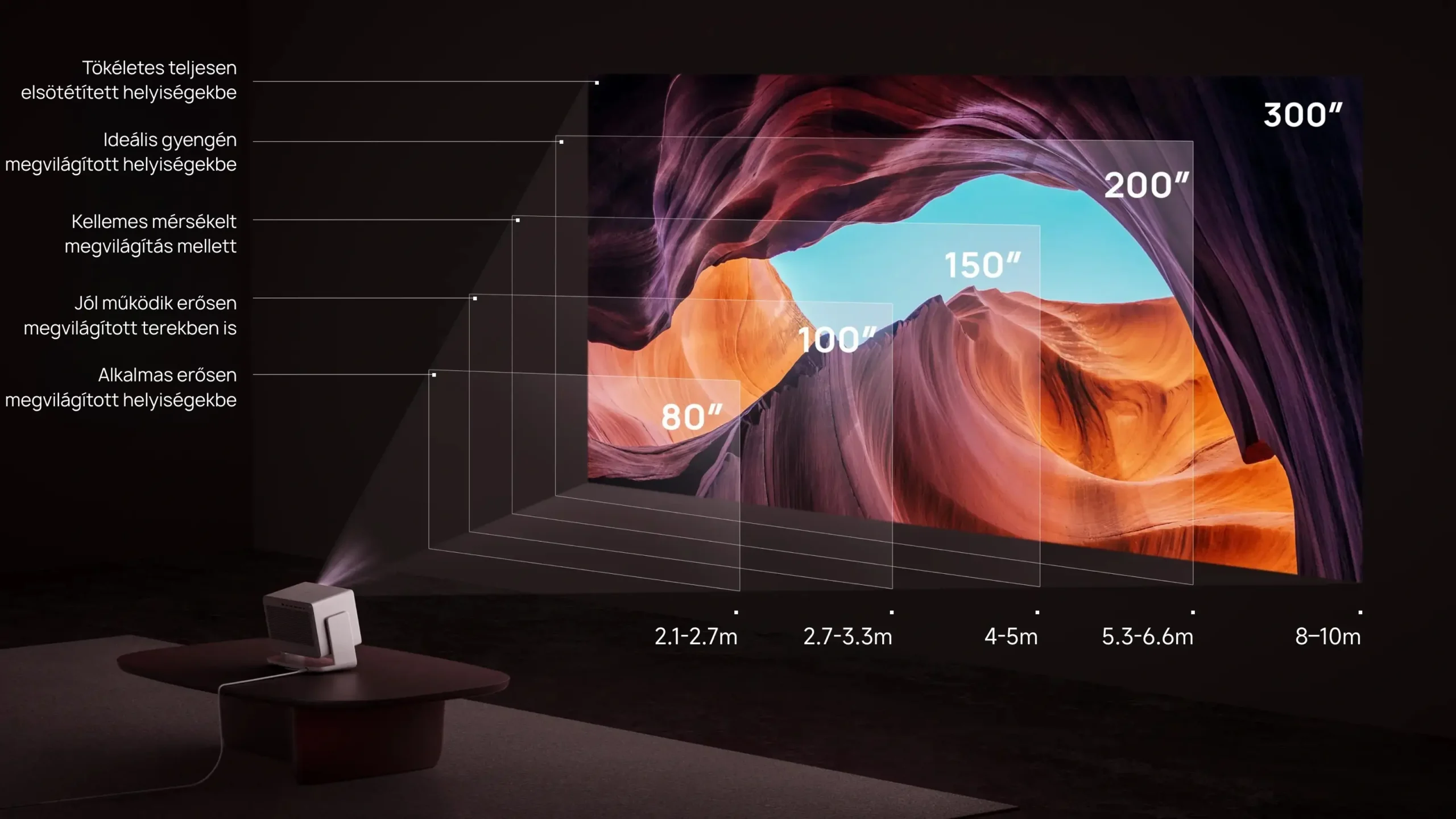 Képméret: 40″ és 300″ között. 101 és 762 cm között