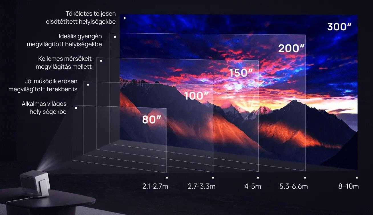 Képméret: 40″ és 300″ között. 101 és 762 cm között