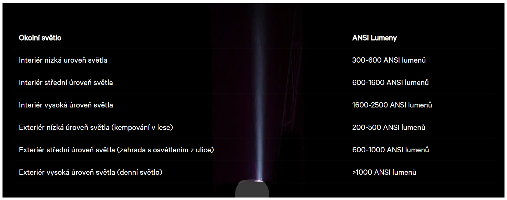 Chcete-li se dozvědět více o počtu lumenů/ANSI lumenů potřebných pro projekt. Níže uvedený tabulkový graf představuje několik rad pro výběr vhodných ANSI lumenů pro váš projektor: