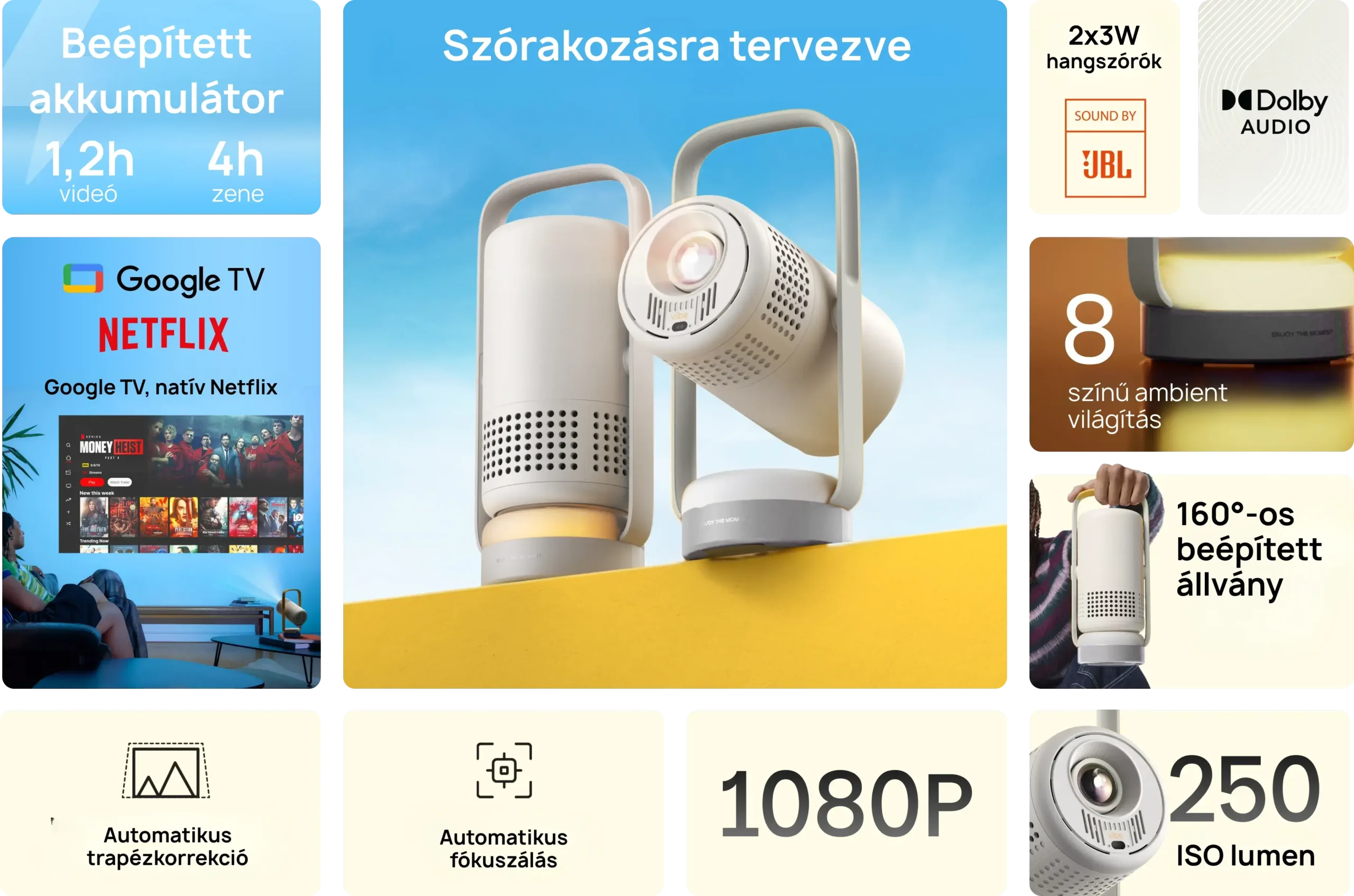 A Vibe One nem csupán projektor, hanem hordozható hangszóró is. A JBL által hangolt két darab 3 W-os hangszórónak köszönhetően minőségi sztereó hangzást élvezhet.